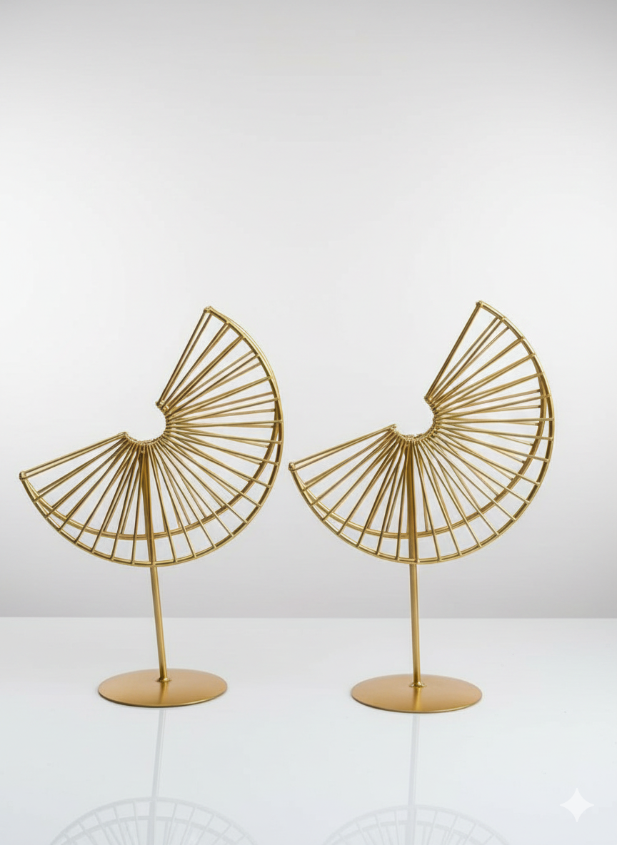 Pair of modern gold wire fan-shaped sculptures on simple round bases, used for decorative table display.